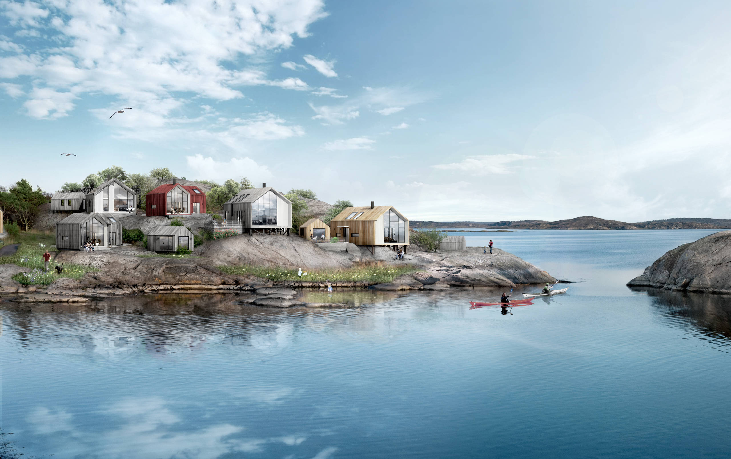 I gamla fiskelägen var bebyggelsen ofta koncentrerad till platser som är skyddade från vind, så att man enkelt kunde sjösätta sin fiskebåt. Dessutom var det viktigt att kunna transportera virket till byggnaderna så enkelt som möjligt. Idag är förutsättningarna annorlunda. Vi kan lättare bygga i svår terräng tack vara lyftkranar och vi behöver inte söka skydd från väder och vind på samma sätt. Det vi värdesätter idag är snarare en obehindrad utsikt och trevliga uteplatser för soliga dagar. I det här projektet, som kallas Lilla Fjellsholmen, har placeringarna av husen baserats på en nytolkning av traditionella metoder. Istället för att vända ryggen mot vinden och havet är ena gaveln uppglasad och riktad mot havsutsikten. Byggnaderna placeras så varsamt som möjligt i terrängen för att bevara de fina klipporna och med mellanrum så att de inte blockerar varandra. Men även byggnadsdesignen kan utformas enligt samma tankesätt, så att tradition och framtidsbehov får mötas. Formen i sig anspelar på äldre kustbebyggelse, men undviker ett påklistrat utseende. Att bara applicera ett utseende utan betydelse och funktion blir mer av en pastisch. Den klassiska takvinkeln är väl beprövad när det gäller att skydda från snö och regn.