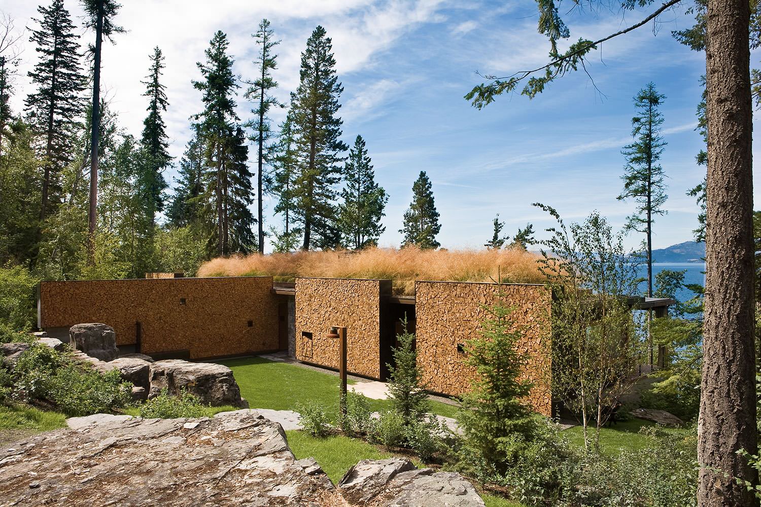 I det här huset finns flera intressanta detaljer. Det är inte bara träväggarna som är speciella, man har även arbetat med väggar av natursten. Ytterligare ett gammalt sätt att bygga på, men som ändå känns samtida tack vare de raka linjerna och att man utnyttjar väggarna för köksförvaring. Stenväggarna känns dessutom helt rätt, eftersom de relaterar till de omgivande klipporna. Ytterligare en koppling till platsen och naturen i en modern tappning.