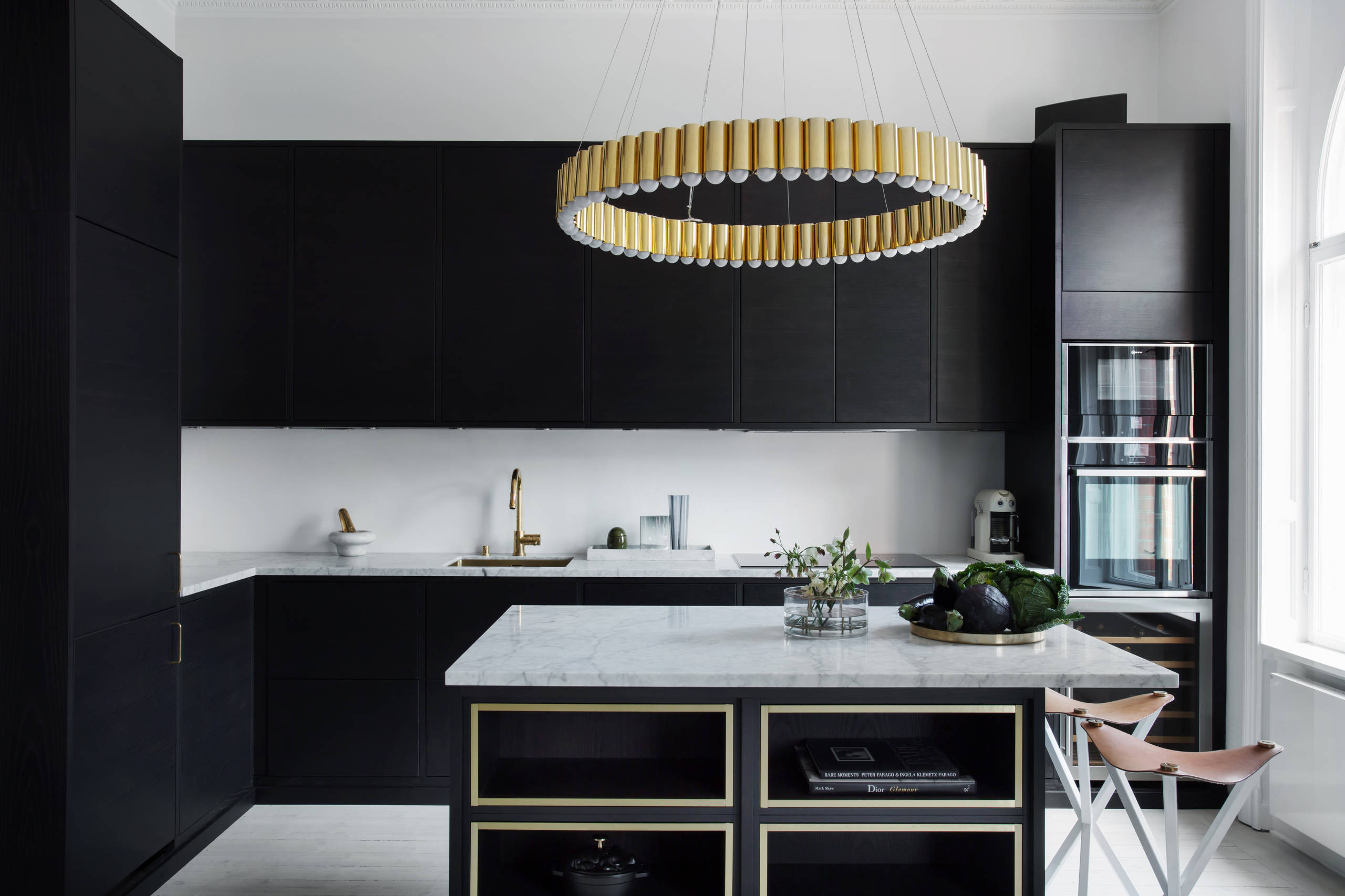 Även här har man valt att använda ett och samma material som återkommande inslag i inredningen. Mässingen ser vi på detaljer i köket och på lampan, och materialet är lätt att plocka upp i ljusstakar eller bordsunderrede i rummet intill.