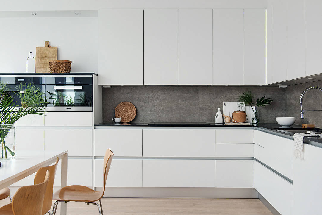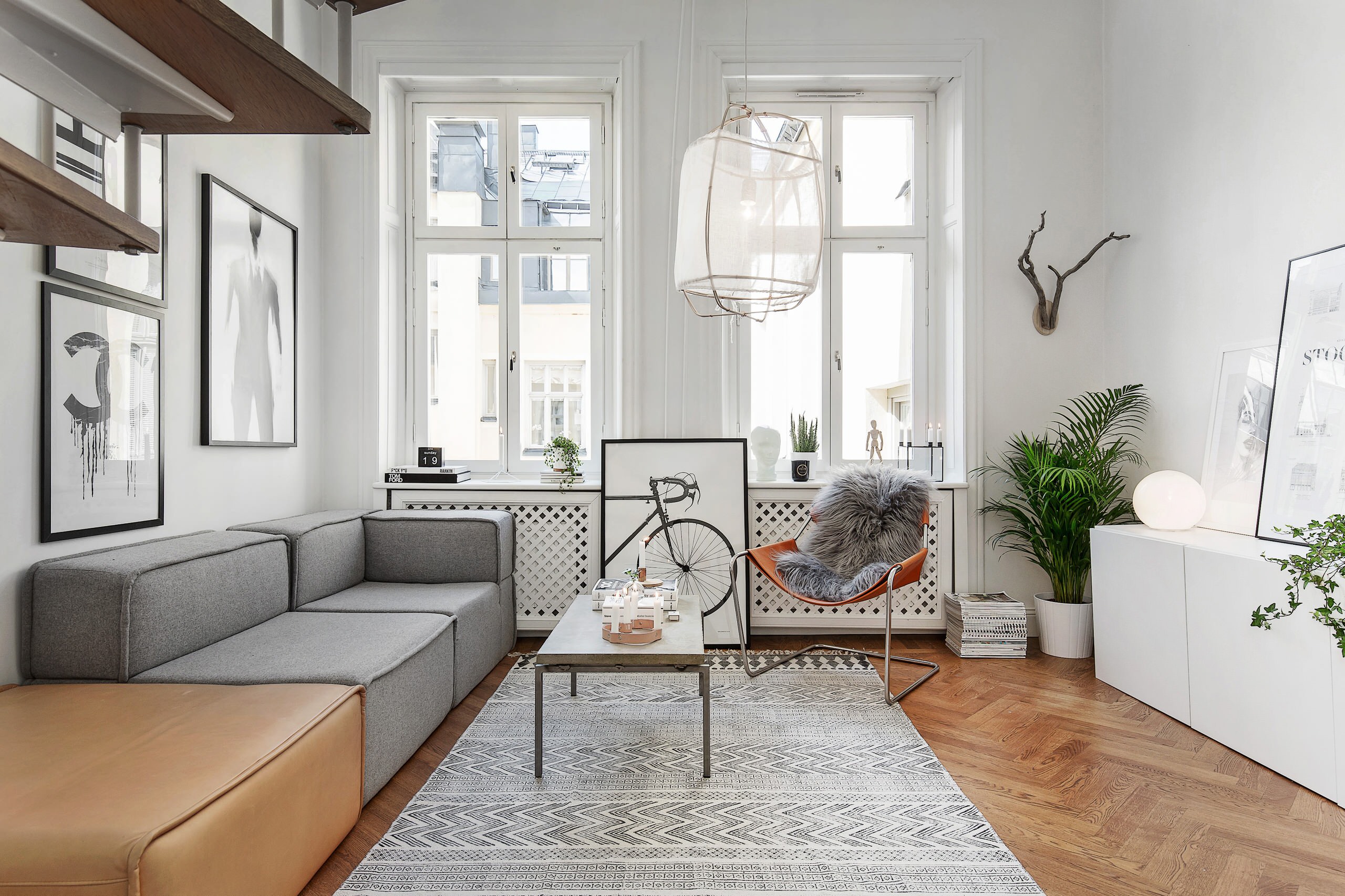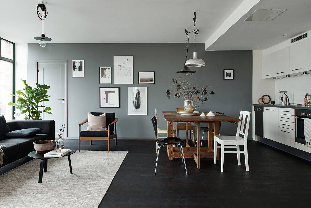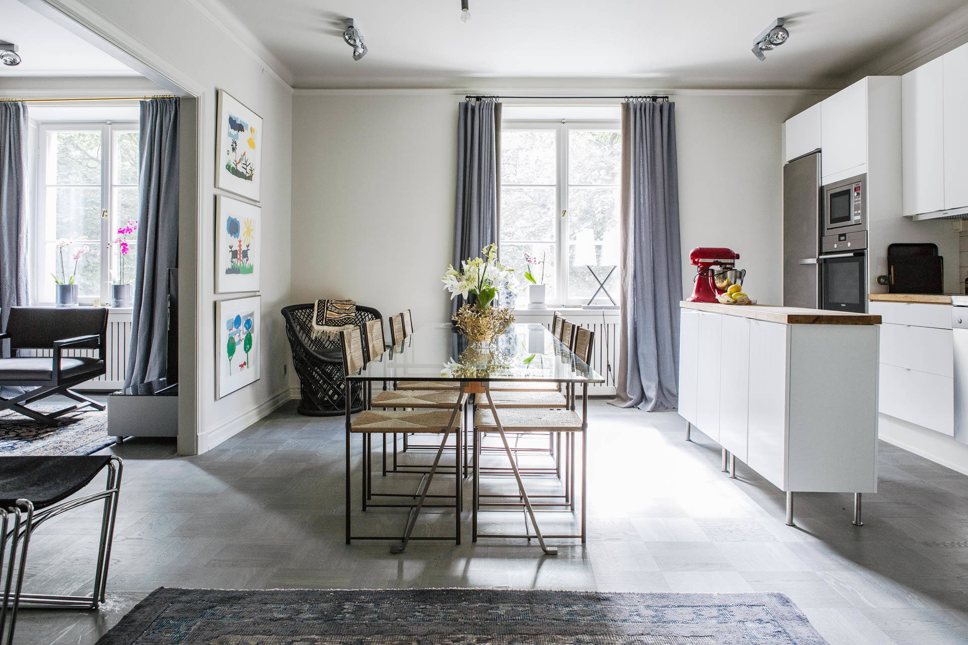 Här har man grått som grundfärg, med det gråa golvet som utgångspunkt, och vi ser hur nyansen plockas upp i textilier som mattan och gardinerna i de båda rummen. Det gör att den öppna planlösningen binds samman. Att låta en färg återkomma i inredningen är ett smart tips för att skapa en röd tråd, och lämpar sig väl för boenden med öppen planlösning.