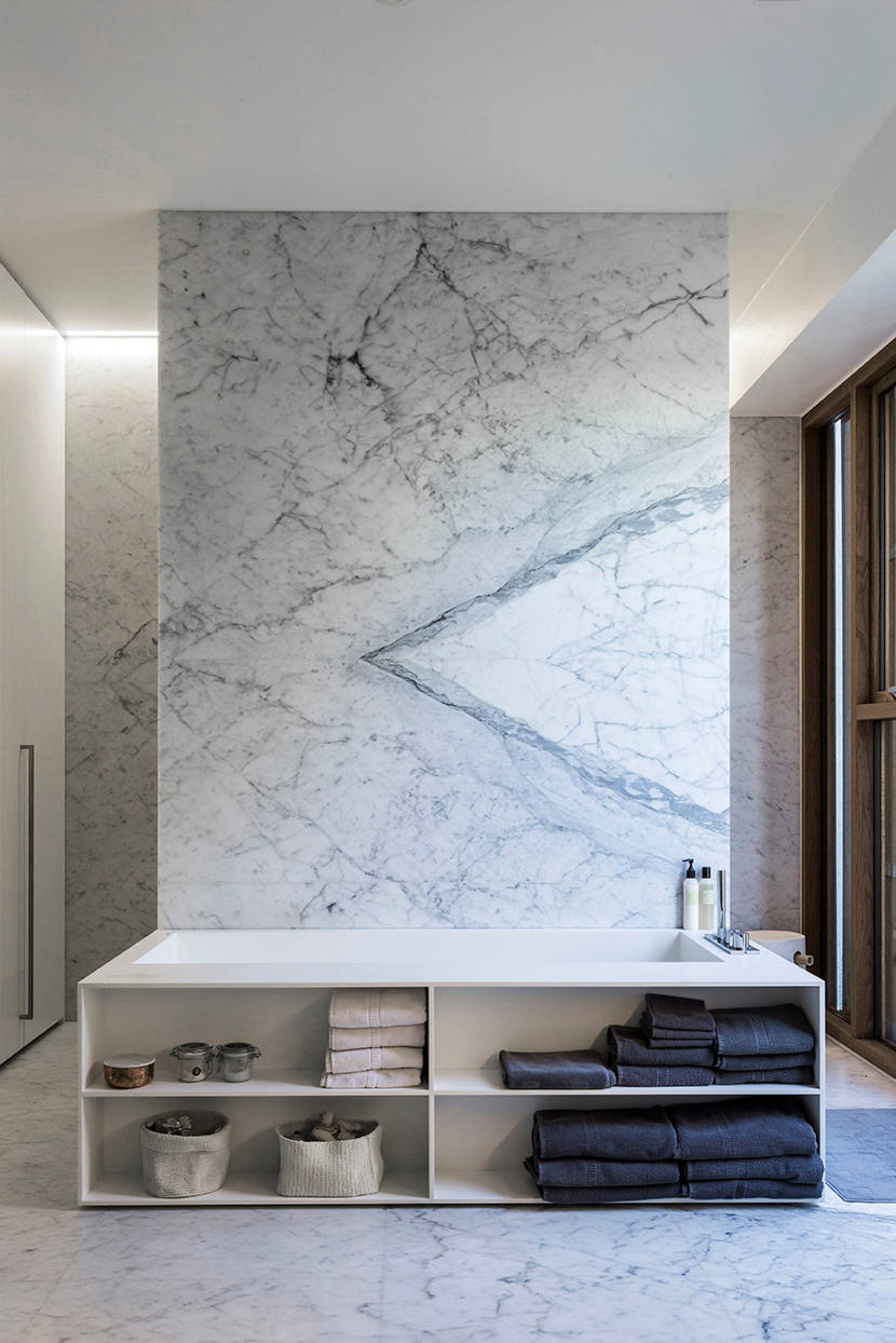 Marmor är ett exempel på material som är lätt att låta gå igen i de olika rummen. Man kan ha det på en bordskiva, kakel i badrummet, en bänkskiva i köket, och så vidare.