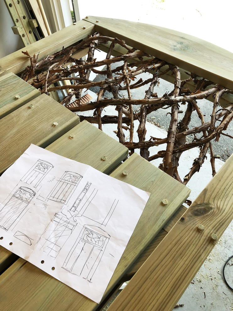 Ingeborg Andersson lavede selv tegningerne af lågen. “Jeg skitserede den for at få et indtryk af dimensionerne rent visuelt. Jeg ville gerne have den til at virke som et godt stykke håndværk, så det var min idé at bruge trædyvler. Jeg har siden måtte høre for, at man “normalt” ikke bruger denne teknik med imprægneret træ – men det er jo min dør!”