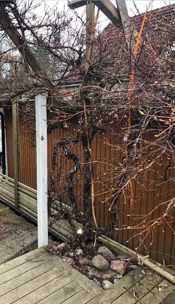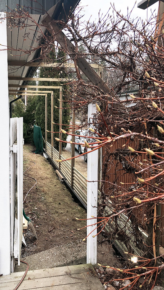 “Der har altid været en låge ved terrasens afslutning, som fører om til til forsiden af huset via langsiden. Passagen har dog aldrig rigtig været brugt, fordi den er meget smal og er fuldt eksponeret for naboer og fra gaden. Derfor ville vi gerne bygge et espalier med klatreplanter,” fortæller Ingeborg Andersson.