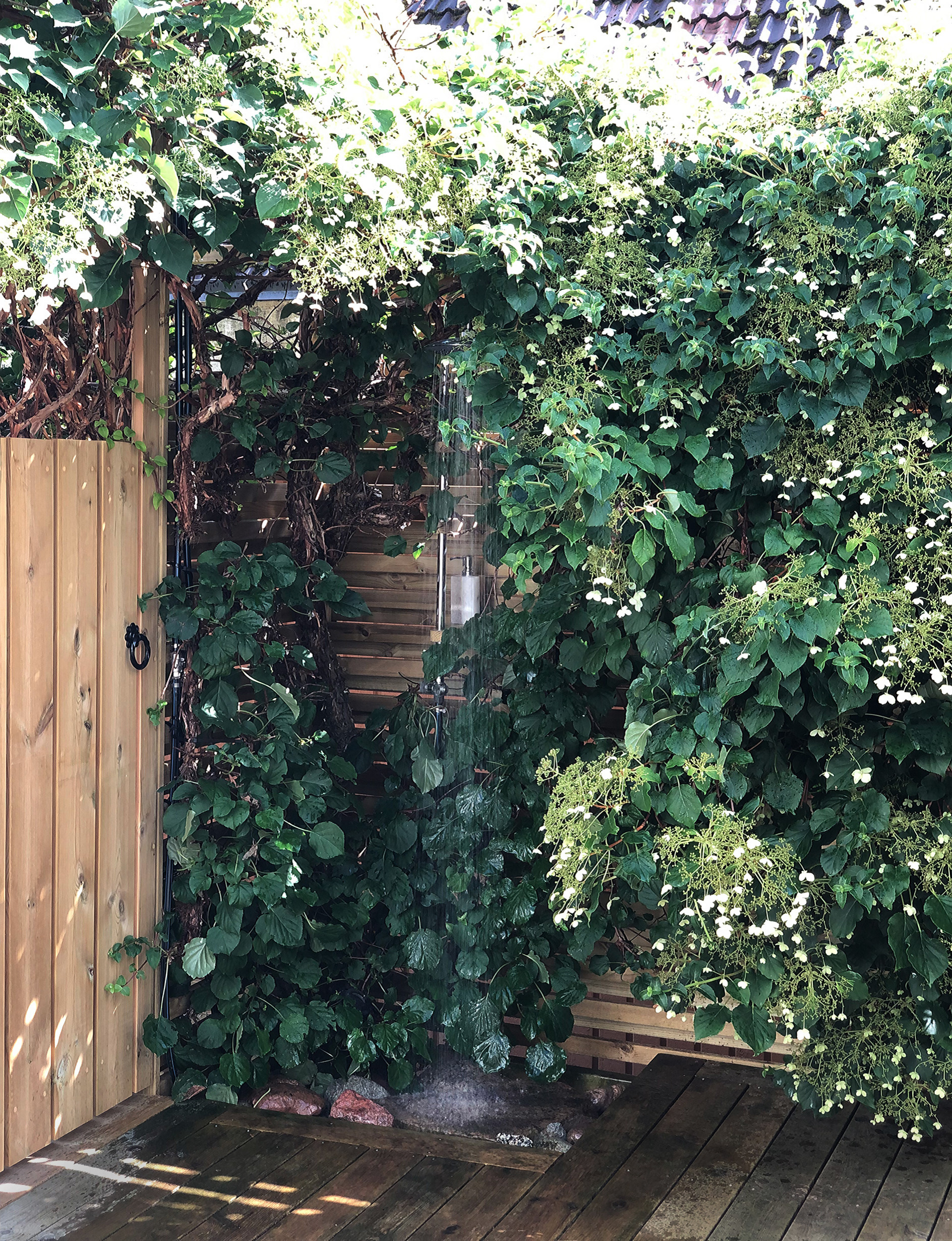 “Her ser vi brusehjørnet med den nye havedør på plads. Det er et sommerbad med solopvarmet vand – simpelthen så skønt, når man har ligget og solet sig eller arbejdet i haven og vil have et hurtigt skyl,” fortæller hun.