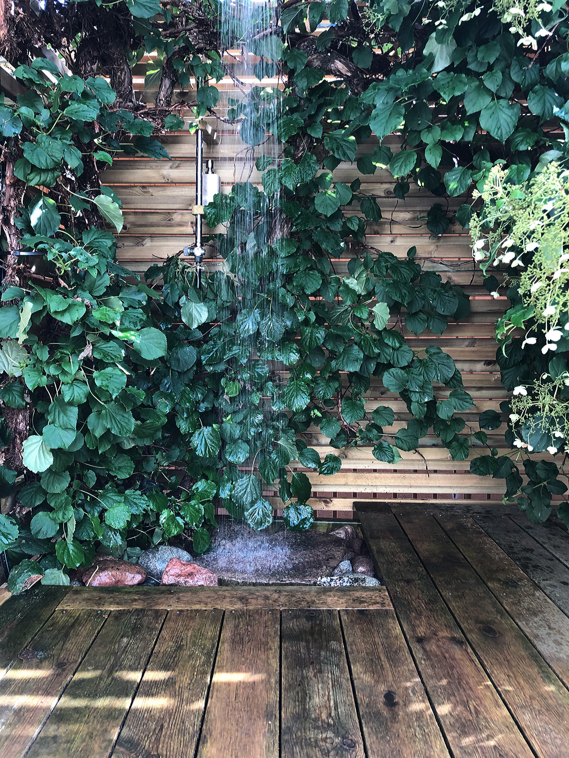 Der er intet afløb under stenene, så vandet løber blot ned under terrassen og ud i undergrunden. “Man står simpelthen bare på stenen med ryggen mod bladene (det er lidt trangt) og tænder for vandet. Vi er meget glade for resultatet,” fortæller indretningsarkitekten.