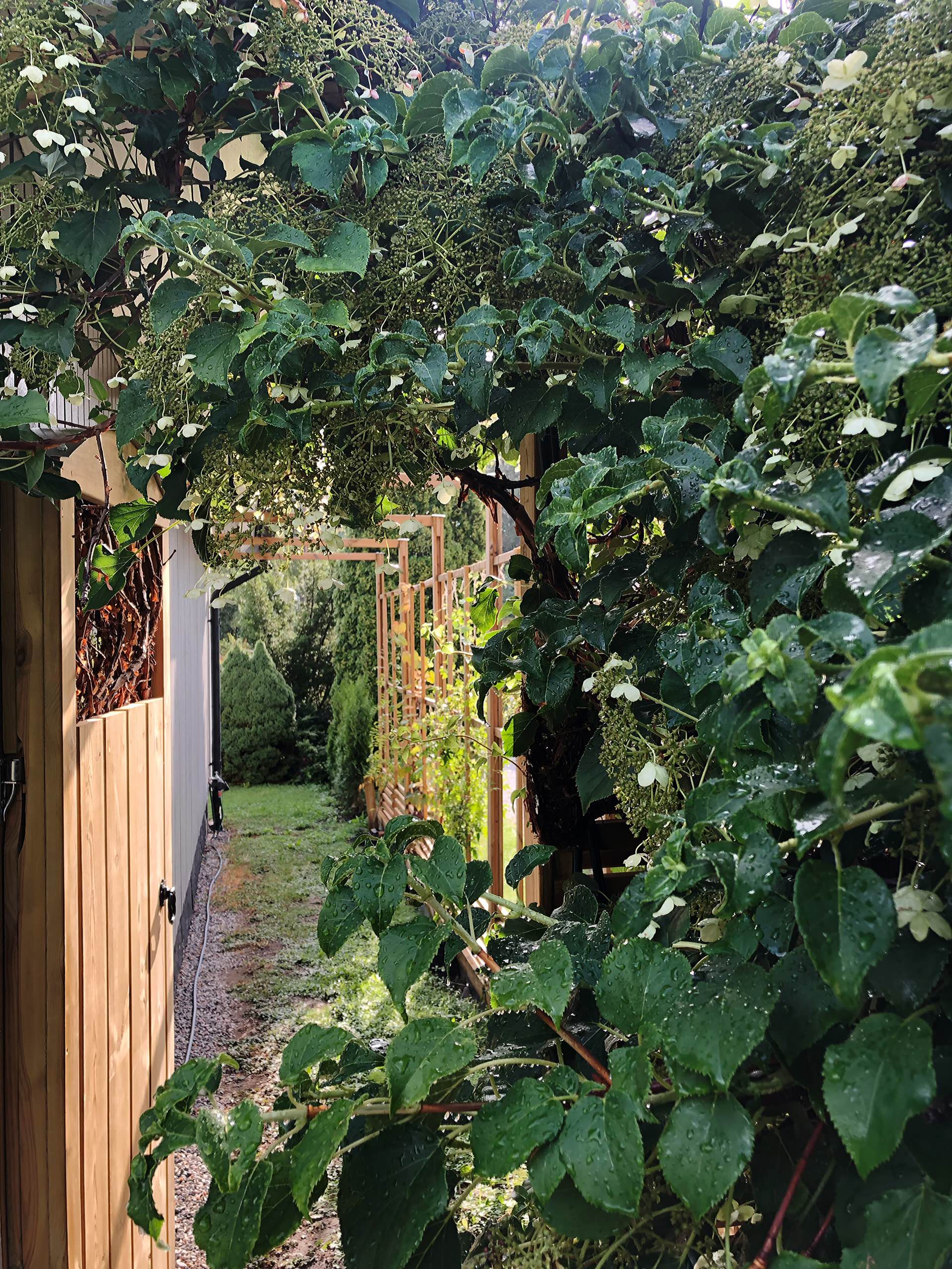 “Her ses det nye espalier – nu med nyplantede klatreplanter. Det er stadig ikke rigtig færdigt, for det skal males sort her næste sæson, og der skal lægges grus i passagen. Jeg drømte oprindeligt om at lægge fliser, men det lader til at være et lidt for tungt og hårdt projekt, desværre. Den nye havedør er dog på plads, og hortensiaen blomstrer!”