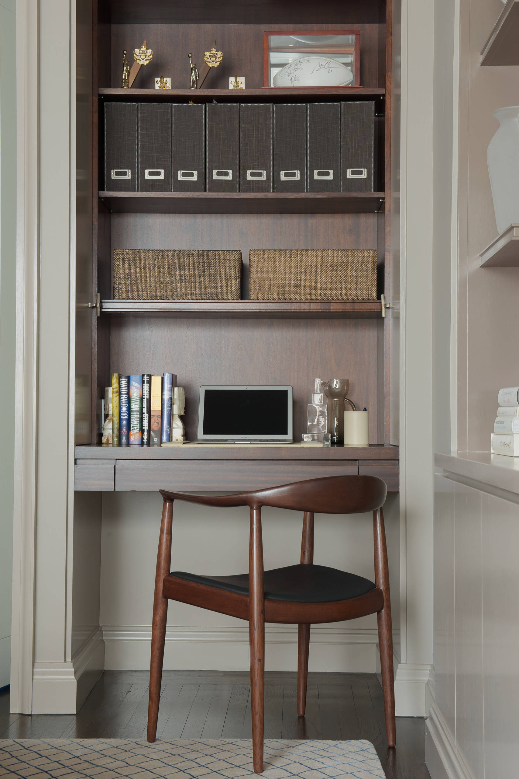 I framförallt äldre lägenheter brukar det gå att hitta små nischer här och där – nyttja en sådan till hemmakontor! Inramningen har du redan, det som kan behövas utöver är hyllplan och en stol. Bilden intill visar också att det är fint att måla in nischen i samma färg som resten av listerna och väggarna.