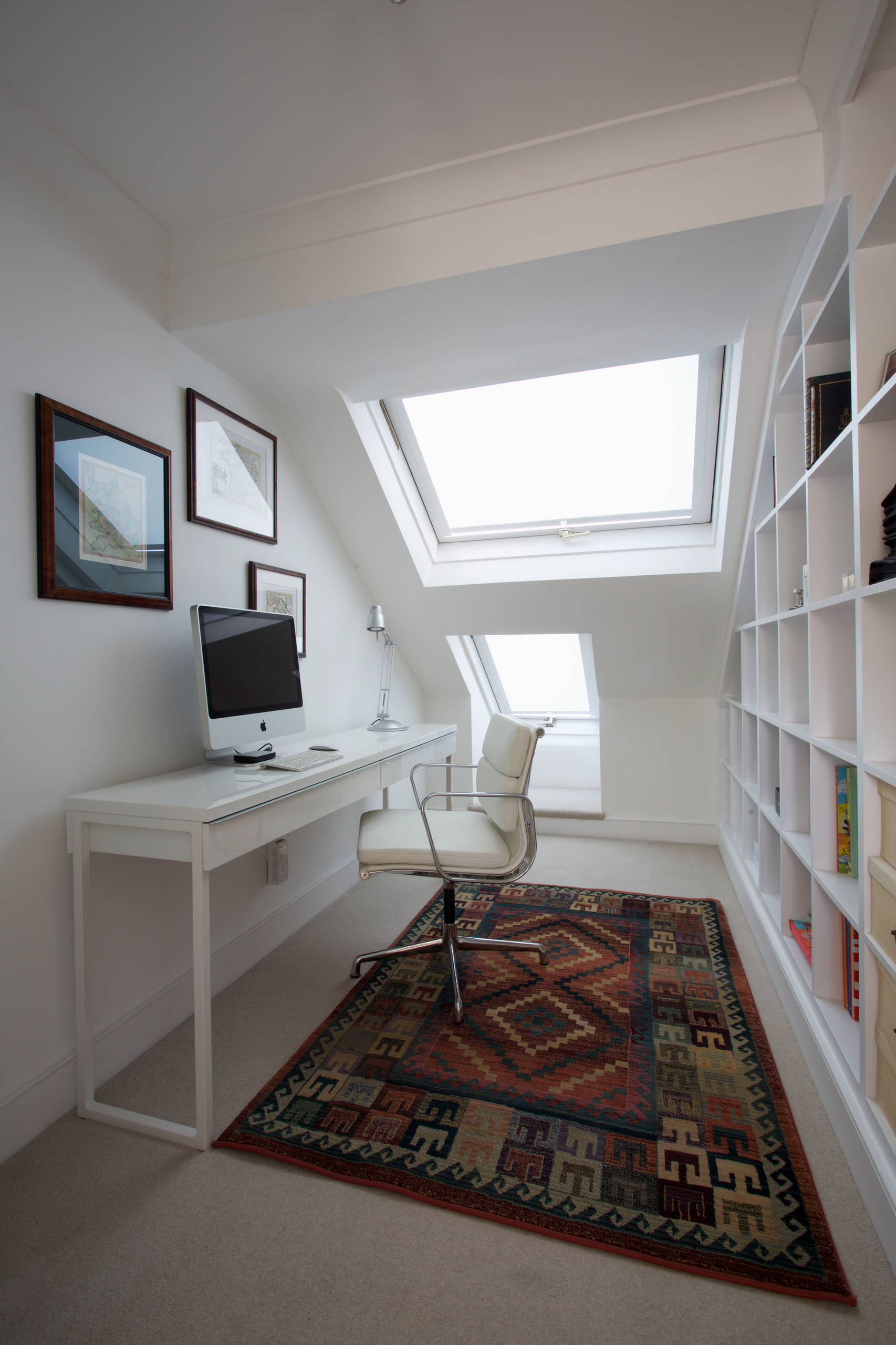Här har man skapat en arbetshörna i dubbel bemärkelse! Den räta vinkeln nyttjas optimalt tack vare den lekfulla bokhyllan. Det är en smart idé att anamma hemma – placera arbetsplatsen intill bokhyllan, då har du redan en stor del av förvaringsfrågan löst.