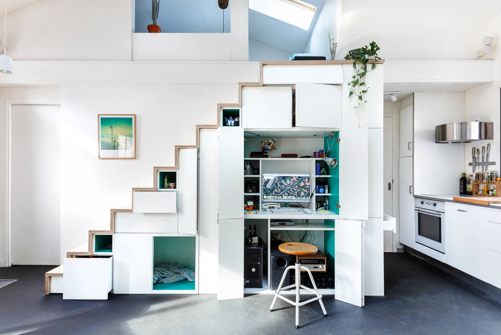 Skoförvaring, bokhylla, förråd…Vi tipsar ofta om det bortglömda utrymmet under trappor som en riktig guldgruva av outnyttjad yta. Om en skrivbordsplats står högt upp på prioriteringslistan kan du inreda några kvadratmeter där trappan övergår till övervåning för hemmajobb.