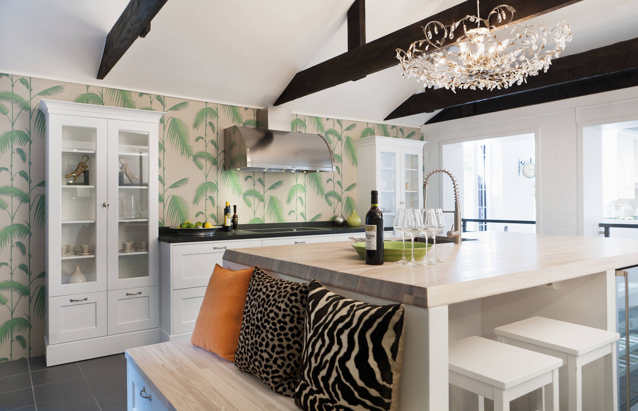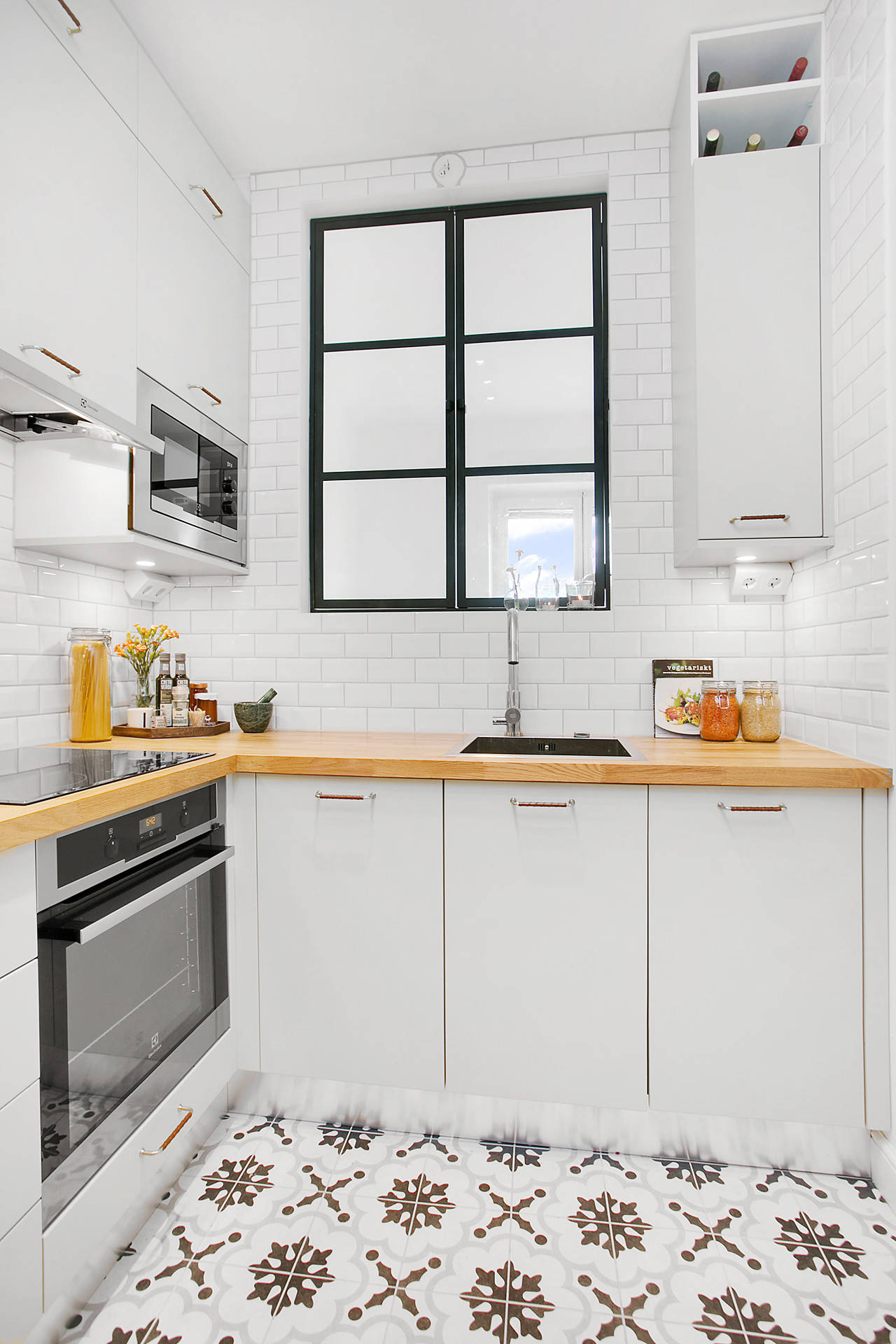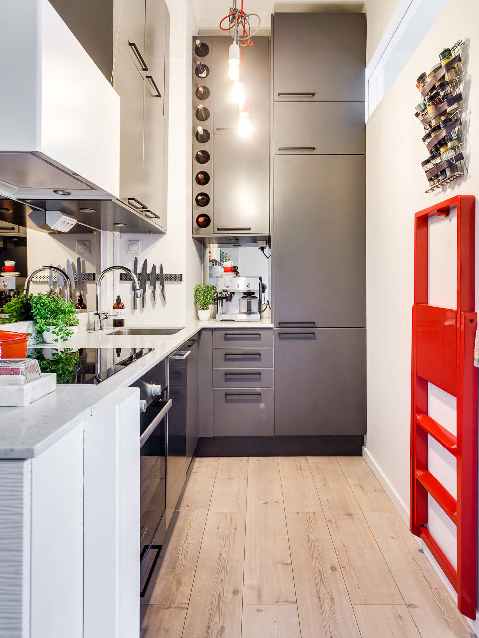 Det supersmarta köket på bilden utnyttjar takhöjden till max, med skåp från golv till tak och ett lättillgängligt vinställ.