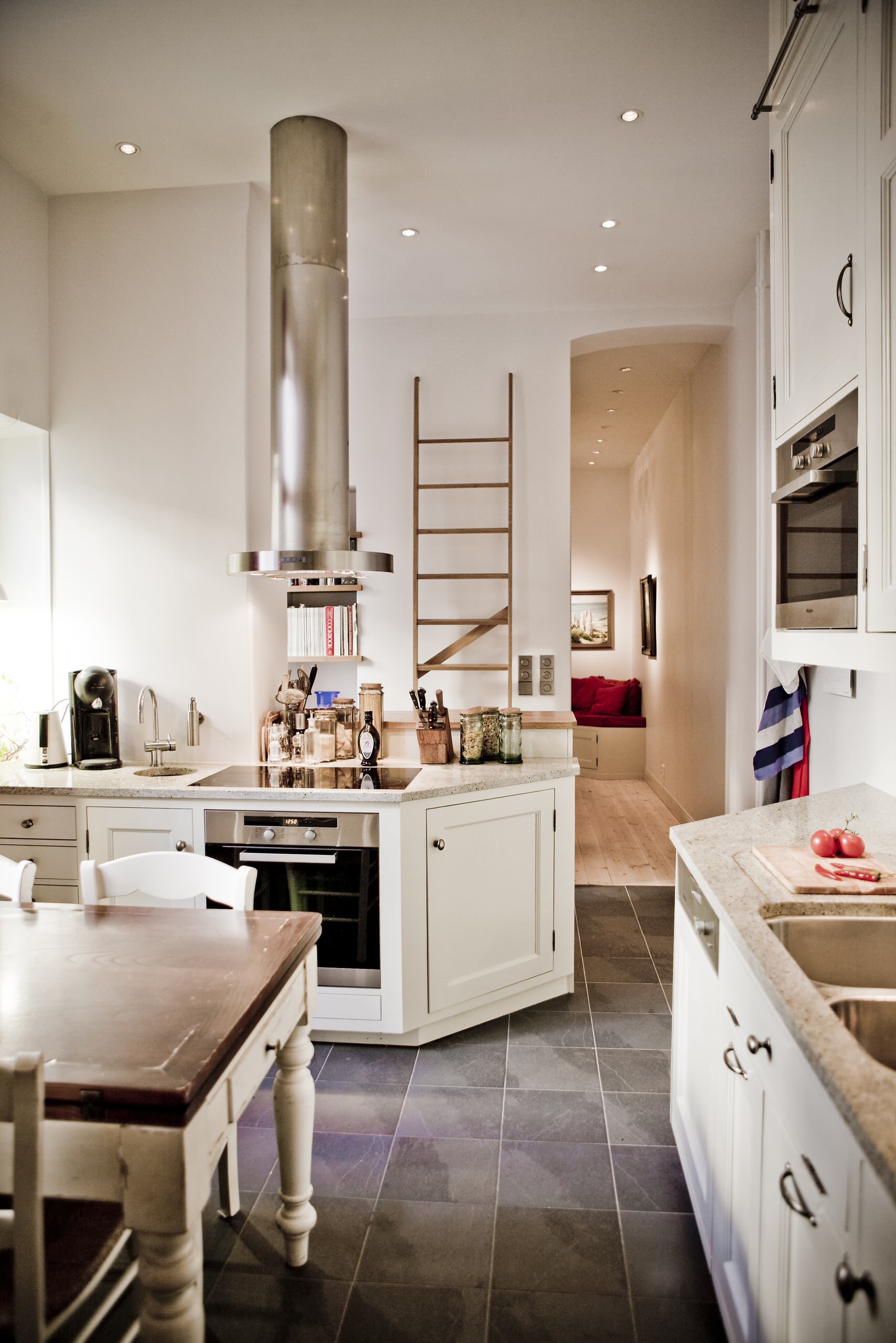 Runt hörnet kan en arbetsbänk eller diskbänk fortsätta i en sittbänk, gärna en som är tillräckligt bred för att man även ska kunna använda den som extrasäng när gästerna behöver övernatta. Bänken kan dessutom dölja förvaring under sätet.