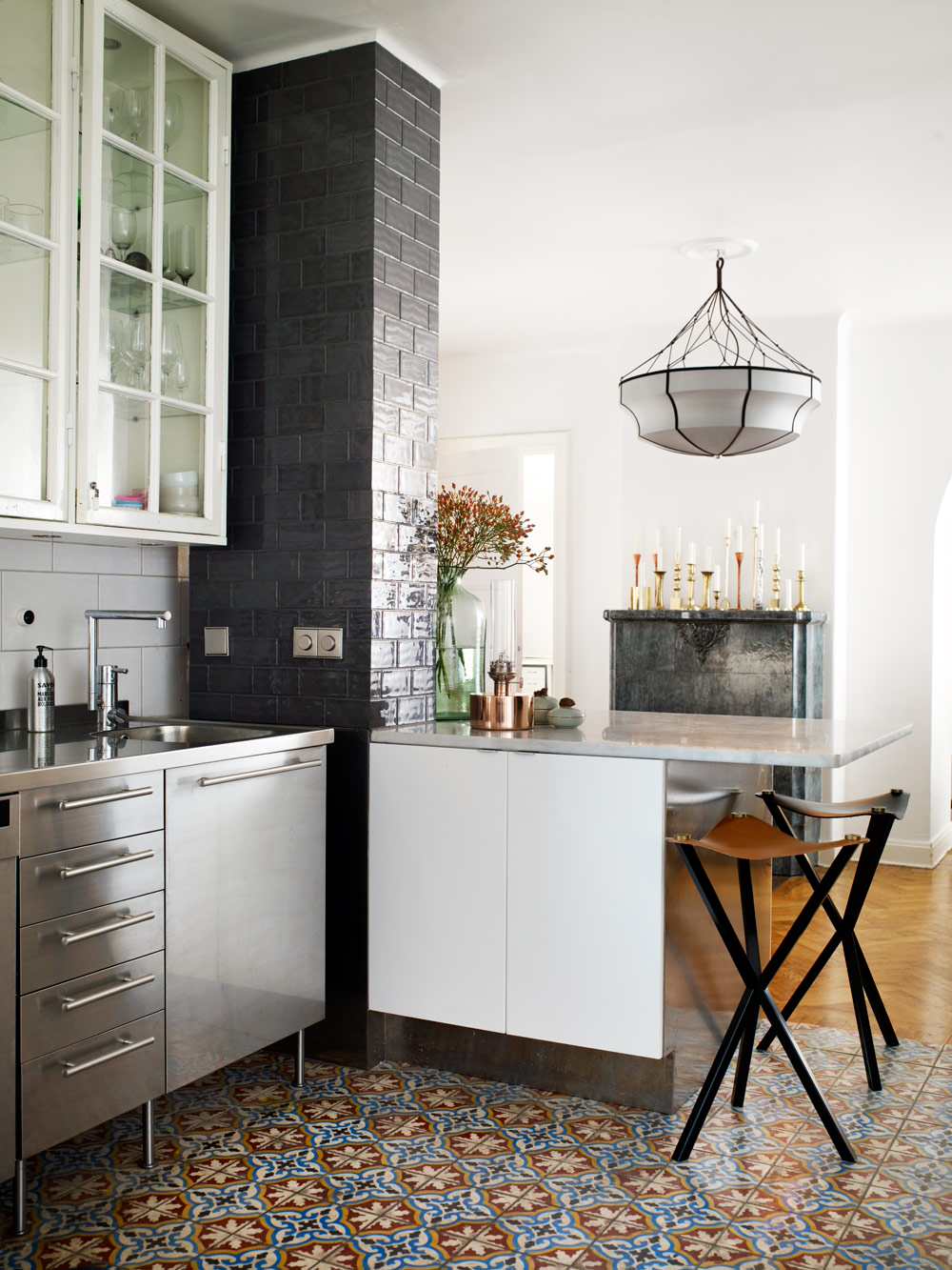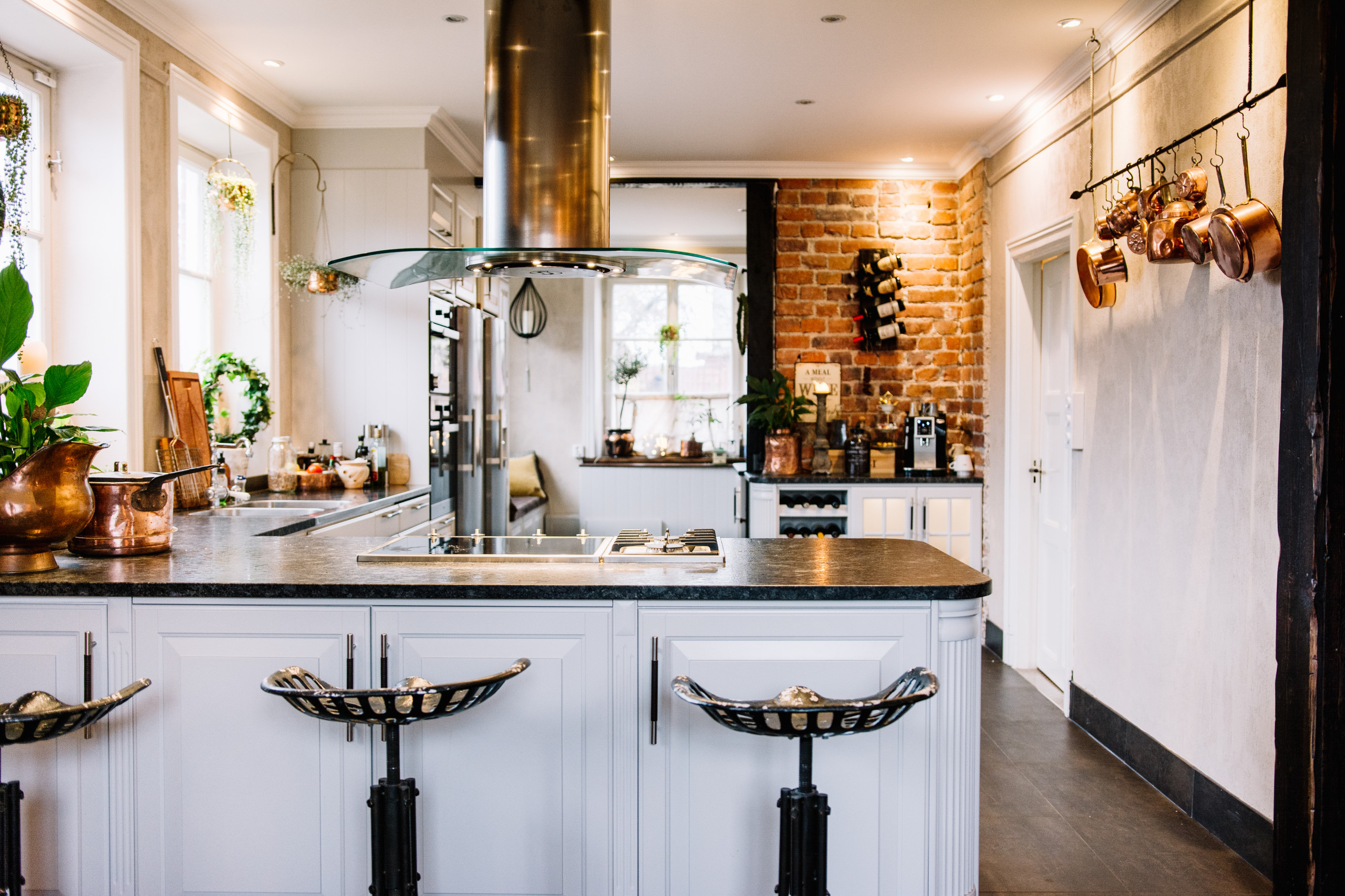 En murstock i köket behöver inte stå tom och ta upp yta. Med ett hörn i köket finns chansen att bygga runt det, och på så sätt få in djupa skåp i köket.