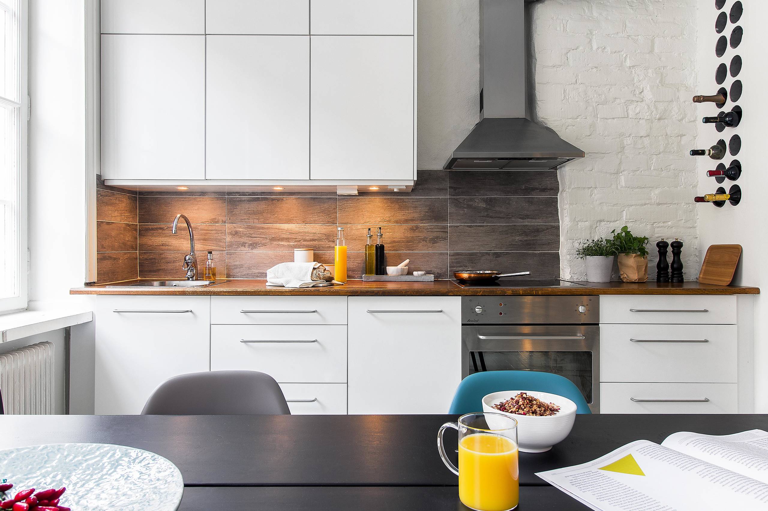 Om du har en etta med litet kök där det är svårt att få plats med ett köksbord, kan en lösning vara att låta arbetsbänken fortsätta ut i en liten avsats och ställa stolar därunder. Samma knep är smart att använda i ett större kök, eftersom det ger extra plats för gäster.