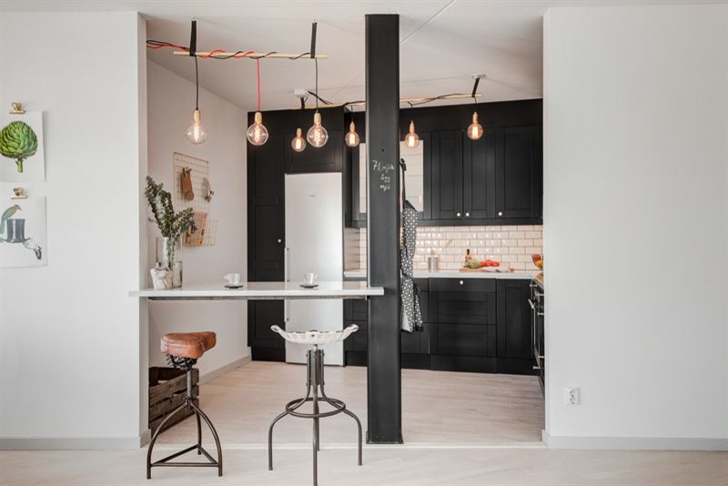 Om du har en öppen, bärande stomme i köket, låt den stödja en bordsskiva som kan fungera som bardisk, arbetsplats eller avlastningsyta. Lösningen frigör värdefull golvyta, och gör det smidigt att komma fram med dammsugaren och moppen.