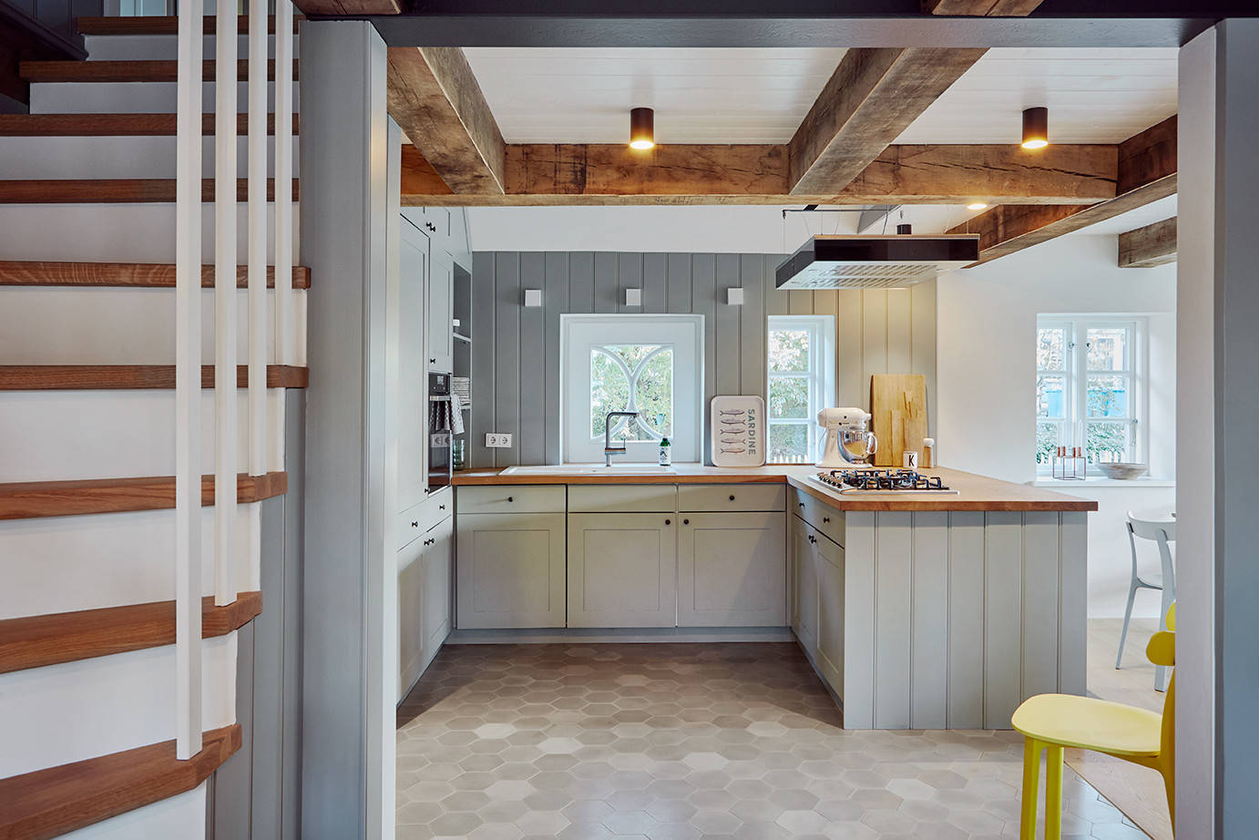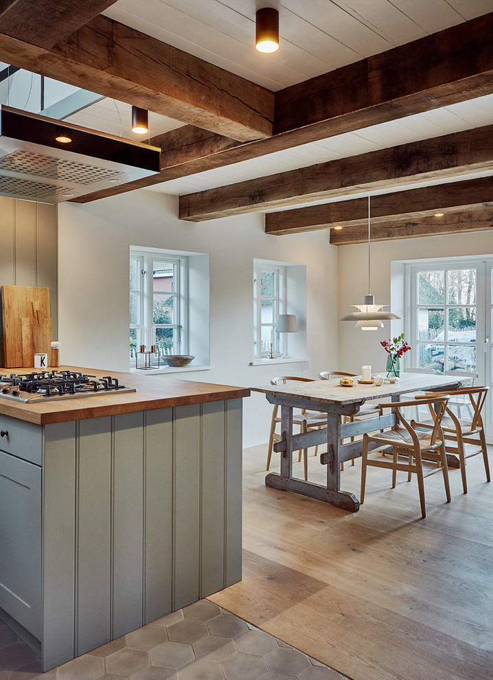 En charmig detalj är det vita taket som står fint mot gamla ekbjälkar. Arkitekterna installerade LED-lampor från Bega överallt för att se till att köket flödar av ljus även under regniga dagar.