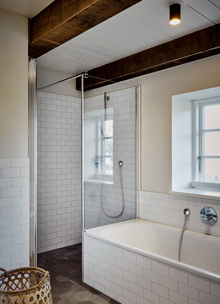 Badrummet har likadant sexkantigt cementkakel som i entrén, medan väggarna och badkarsinramningen är gjorda med diskret metrokakel. Det fungerar ihop som en minimalistisk övergripande känsla.