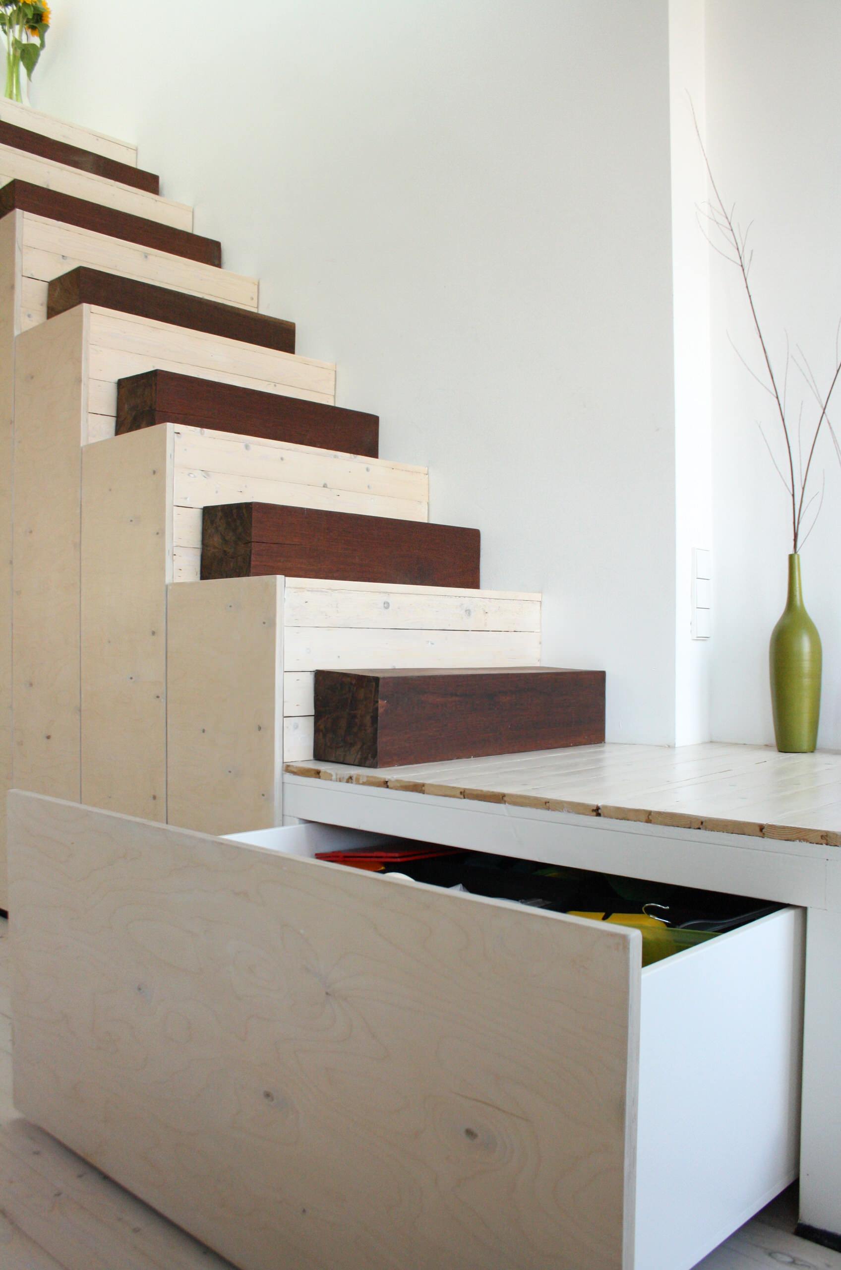 Spel, skor, sladdar eller saker till köket. Dessa djupa lådor som förvaras i trappan kan nyttjas till det mesta. Att de dessutom kommer i en höjd där man lätt kan leta igenom dem gör dem extra användbara.