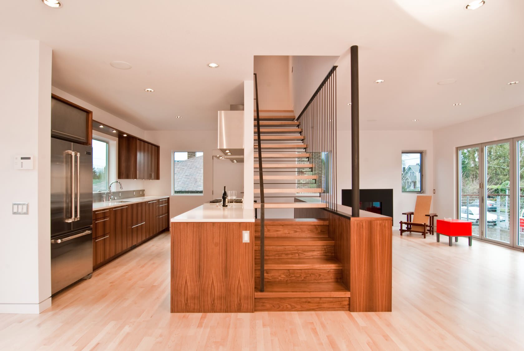 Sällan har en trapp nyttjats så snyggt och praktiskt! Integrera kökets arbetsbänk med trappan, en klart annorlunda men ack så praktisk lösning. Också bra om man bestämmer sig för att flytta köket till det som kanske varit vardagsrum, eller bygger till i källaren.