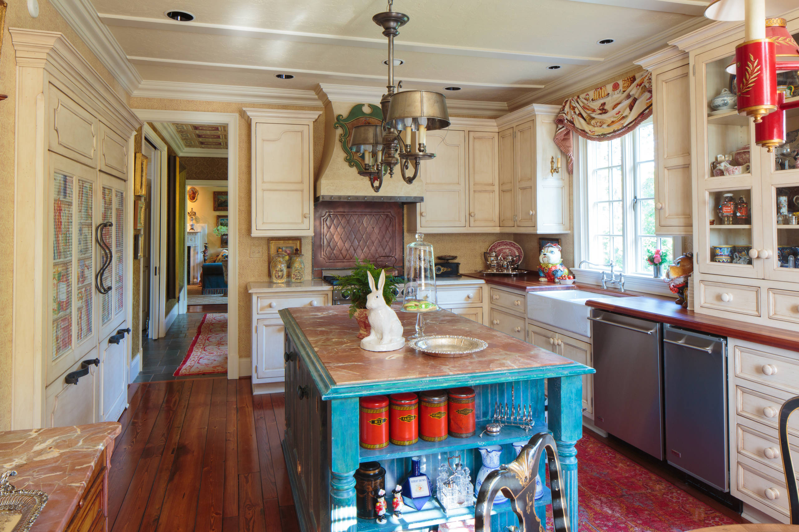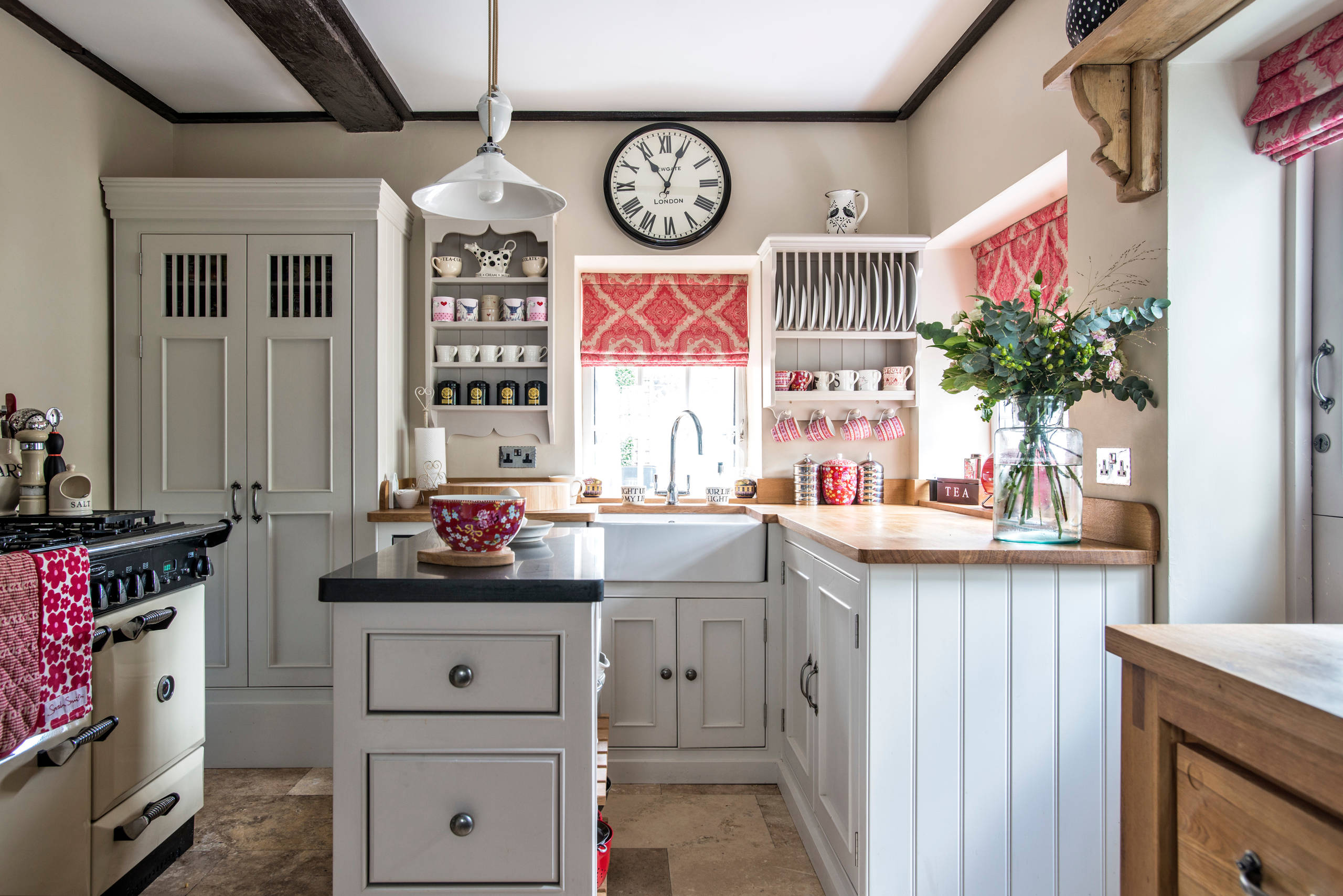 I det här lantliga köket har man använt printad juteväv för att skapa en enkel gardin, som med sin oblekta och grova struktur ger köket en rustikt lantlig känsla. Samma material har använts för att skapa förhängen som döljer utrymmet under vasken – ett vanligt sätt att skapa stängd förvaring i gamla lantkök.