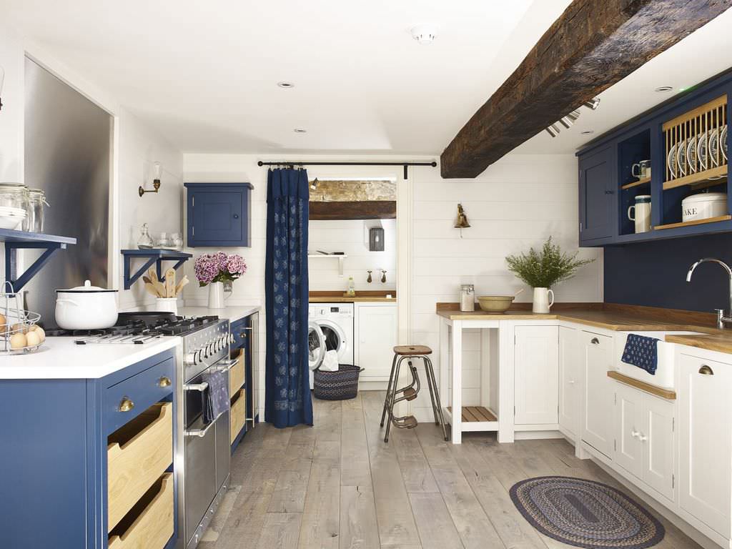 Har du ingen köksdörr, men vill ändå kunna stänga till om stök och os? Ett draperi kan vara lösningen! Här har en blå gardin monterats på en stång, som vackert matchar de blå skåpen i köksinredningen.