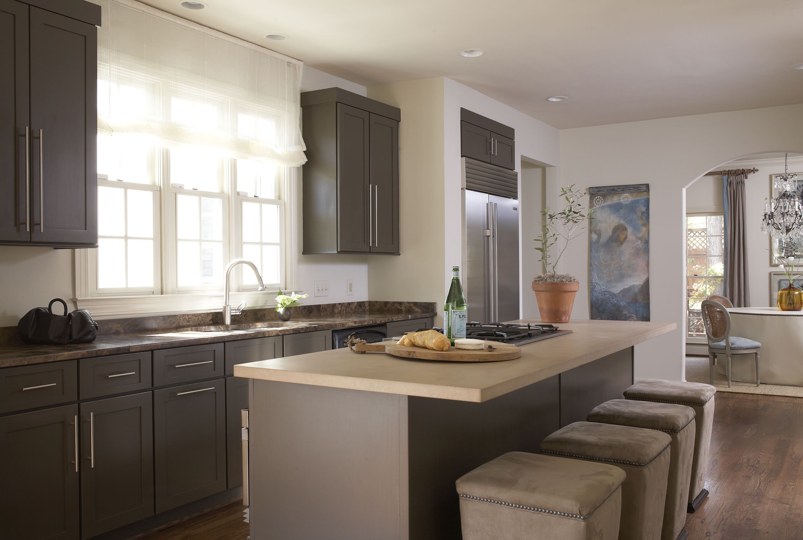 Ibland vill man bara ha en diskret gardin, som gör att man slipper bländas av solen när man lagar mat. Den här skira hissgardinen i vitt passar i princip var som helst, och silar ljuset på ett vackert sätt. Här kontrasterar den vita, mjuka gardinen även på ett fint sätt mot de mörkt antracitgrå köksskåpen.