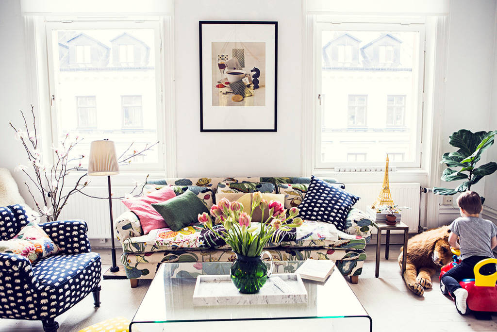 Så länge du har en färgkarta som du utgår ifrån kan du blanda mönster i all oändlighet. Se också hur blommorna plockar upp både färgerna och det blommönstrade sofftyget. Snittblommor är ett ypperligt sätt att ge rummet det där lilla extra för en billig peng, enkelt att både förnya och förändra.