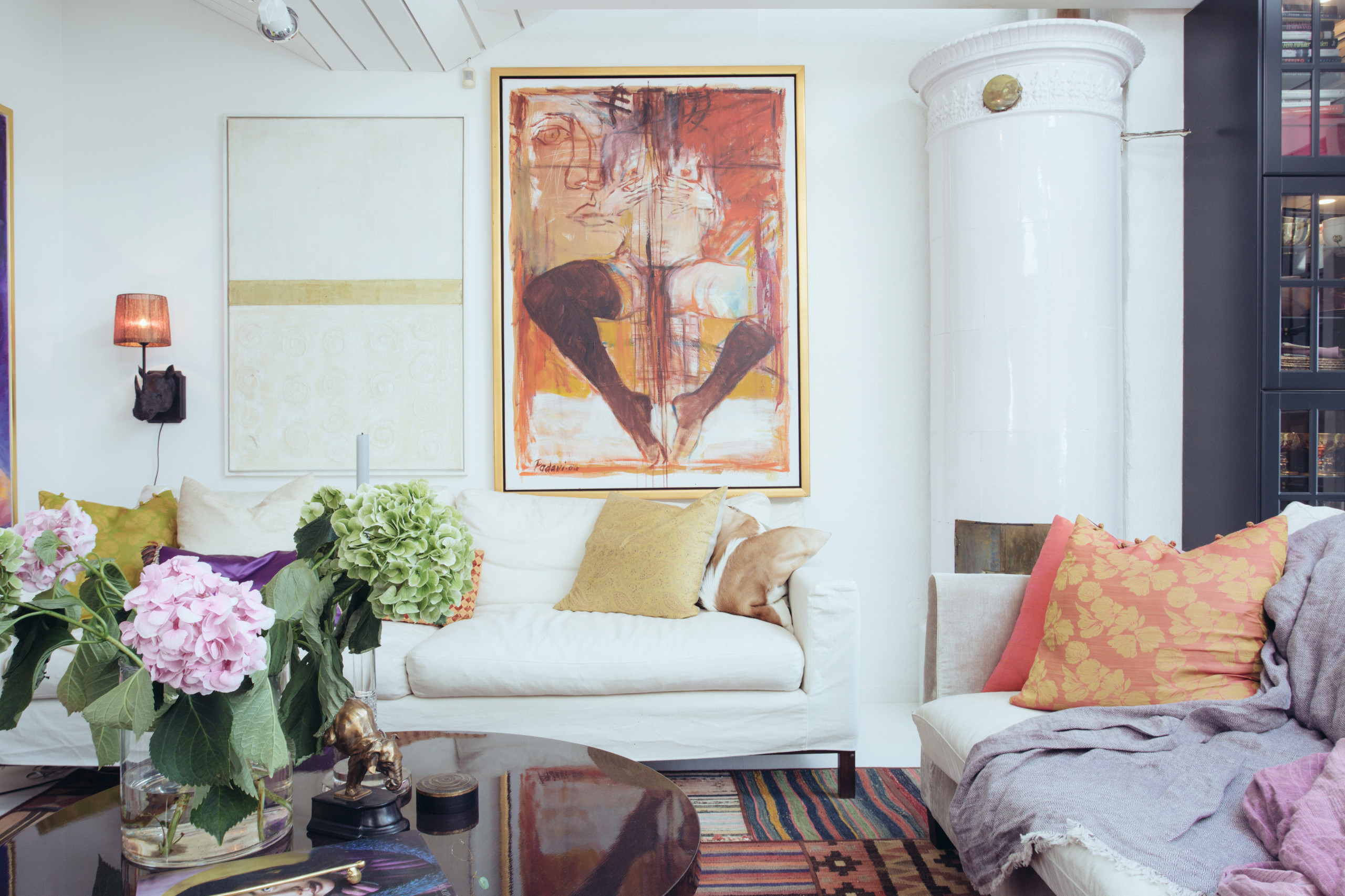 Utgå från hela rummet när du väljer kuddar. Här har färgvalet baserats på den magnifika tavlan på den vita väggen. De brandgula färgerna, som i tavlan blandas med vitt, rött och brunt, hittar vi på så väl kuddarna som mattan.