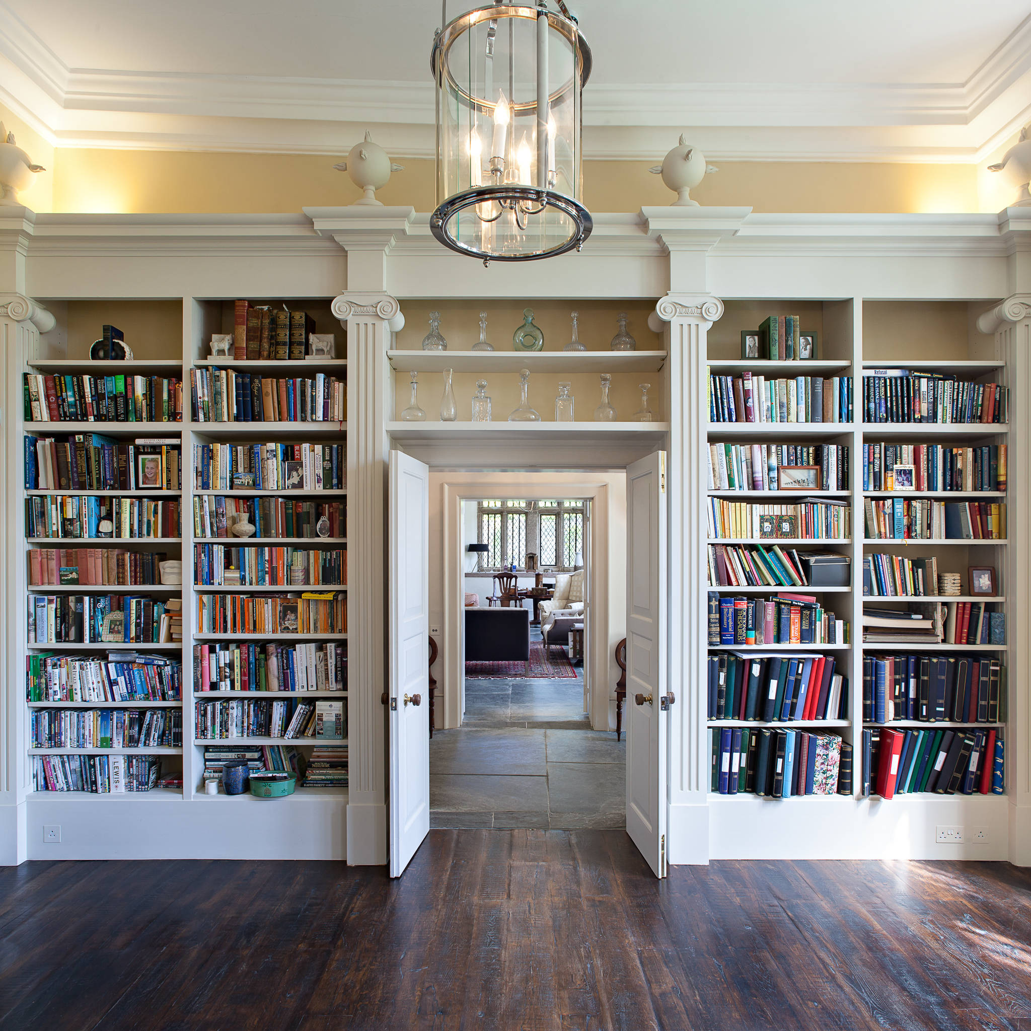 Visst är det härligt med en välfylld bokhylla, men en bågnande hylla där allt är instoppat huller om buller kan förstöra ett helt rum. Spara de böcker du verkligen älskar, ordna dem efter storlek och bryt upp hyllorna med olika dekorativa objekt och belysning. På den här bilden har de toppat hyllan med glasvaser ovanför dörren, och lättat upp hela intrycket.