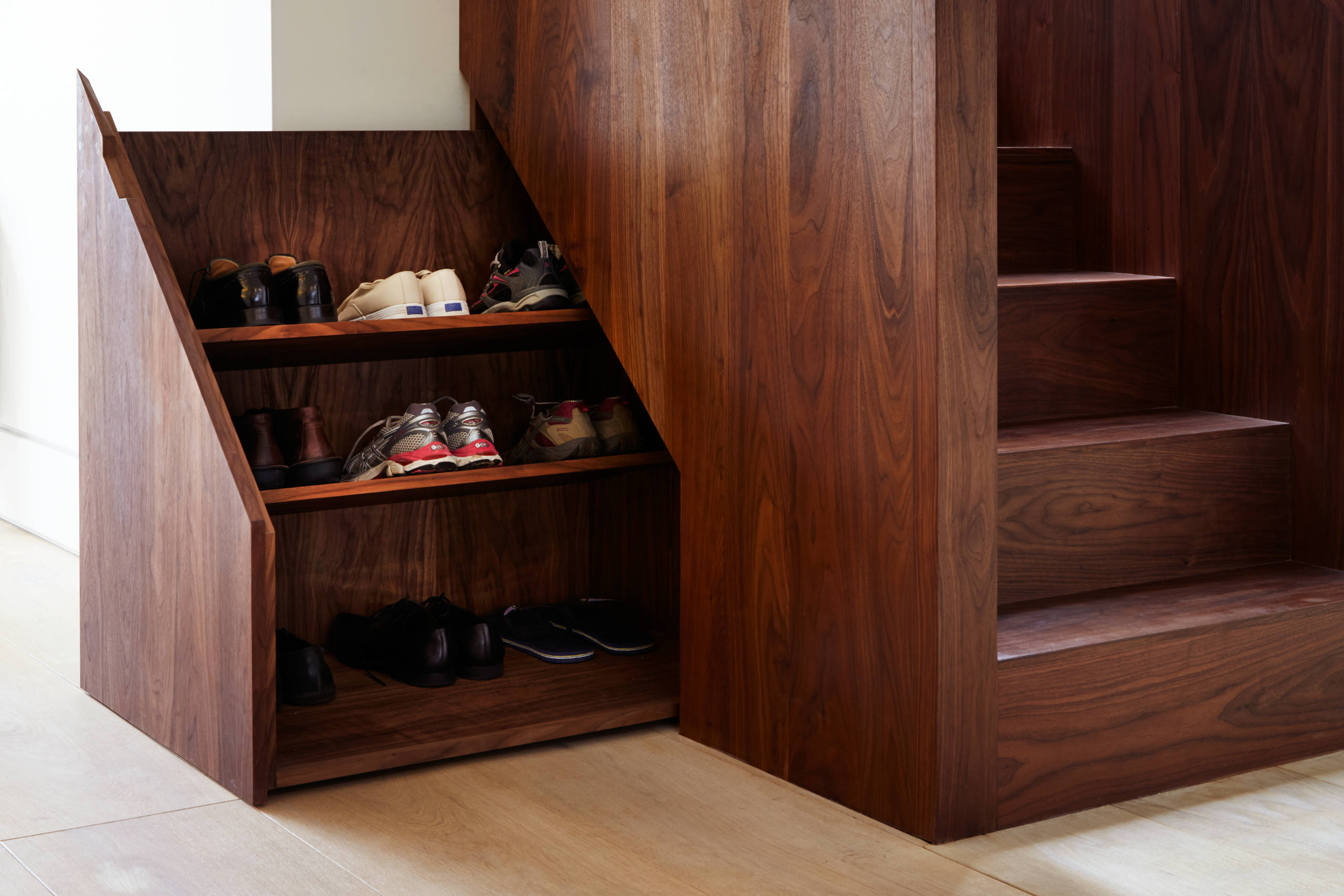 I en familj är det lätt hänt att man samlar på sig en väldig massa kläder och skor, med resultatet att hallen befinner sig i ett ständigt tillstånd av kaos. Ett första steg på vägen mot en mer harmonisk och ordnad hall är att rensa bland skorna. Bort med alla urvuxna skor, bort med alla skor som hör till en annan säsong och kan ställas undan i lådor, och bort med skorna som ingen använder. Skänk bort eller sälj! Nästa steg är att skapa smart och snygg förvaring för de skor som fick vara kvar. Ju mer stängd förvaring, desto lugnare helhetsintryck och lättare att hålla ordning. Här har man till exempel utnyttjat utrymmet under trappan för att få bort skorna från hallgolvet.