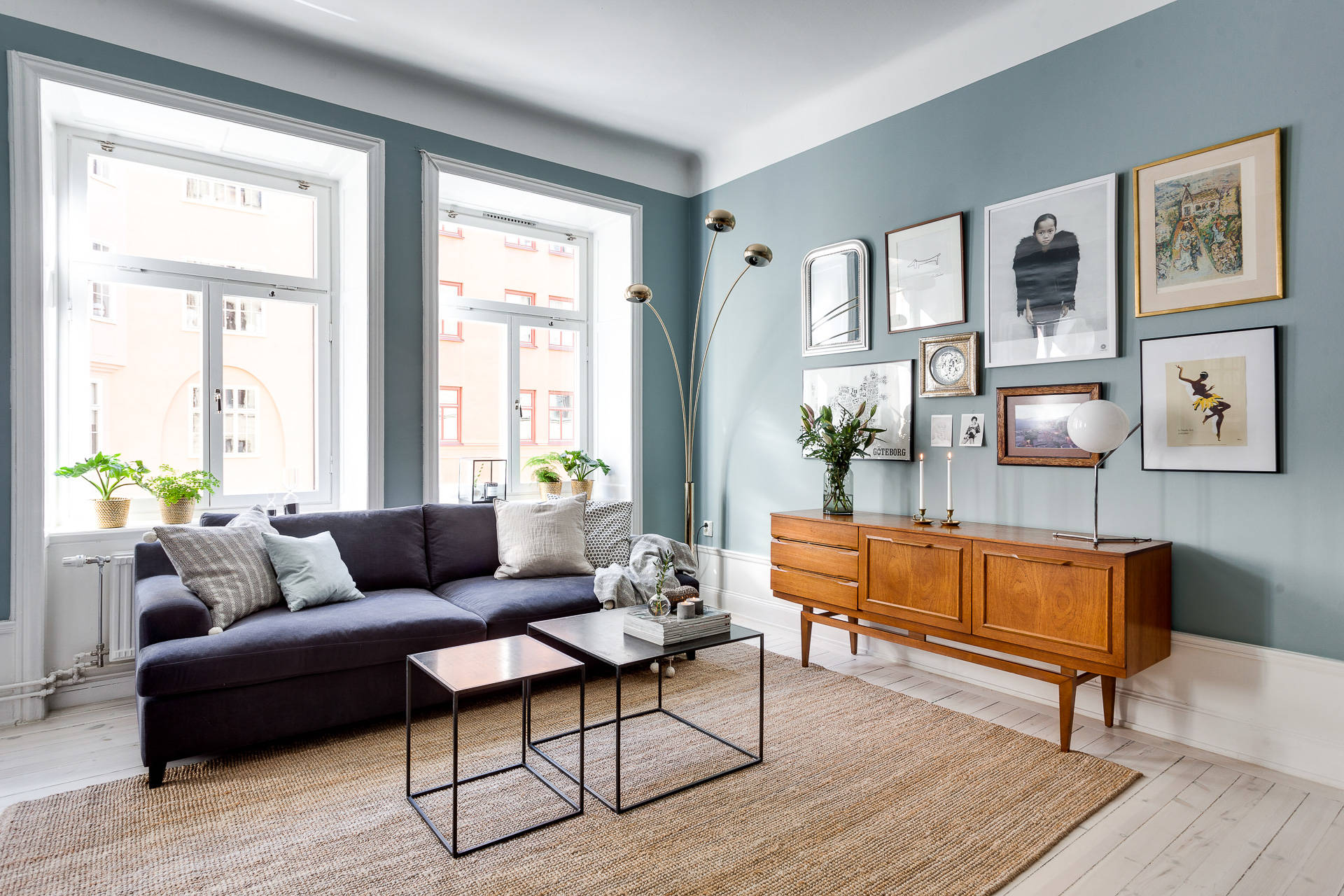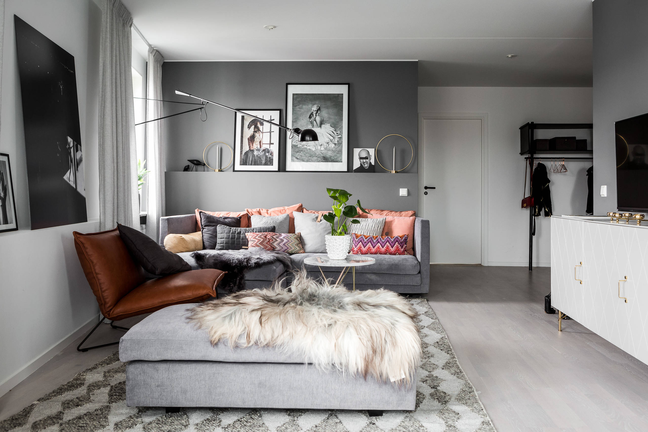 - 30% av rummet bör bestå av en sekundärfärg. Här passar det bra att plocka in de stora möblerna, såsom exempelvis en soffa och matta, i en ny nyans.