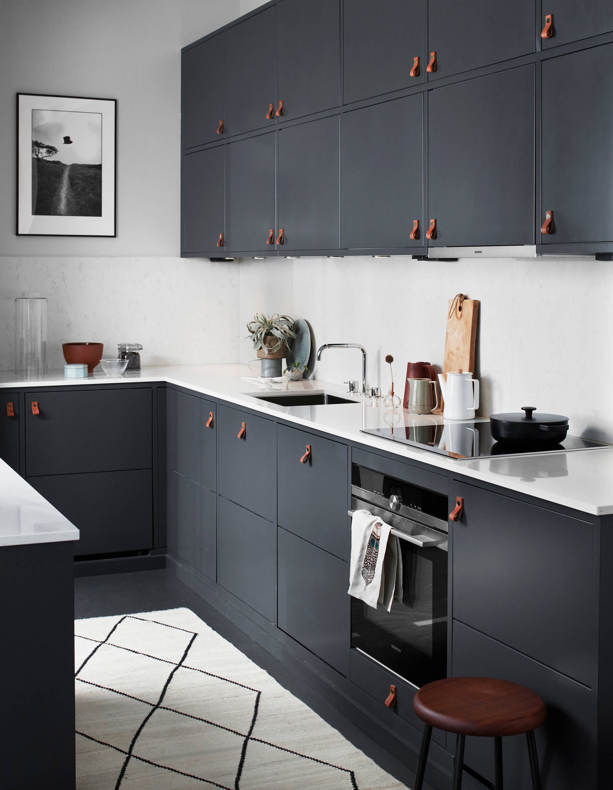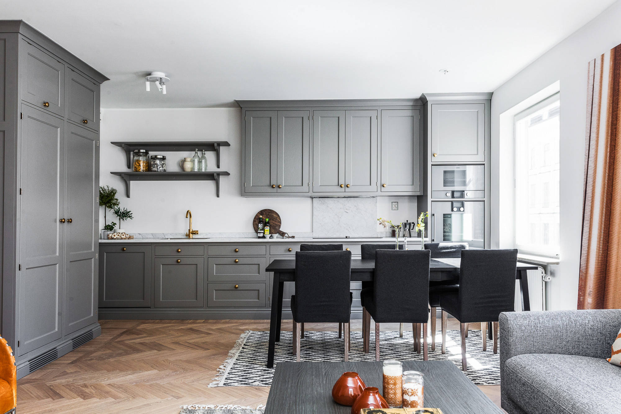 Vill du inte måla om väggarna utan behålla dessa neutrala kan du istället gå all-in med exempelvis ett kök i en mörk färg. Det skapar kontraster och ger ett fint slutresultat.