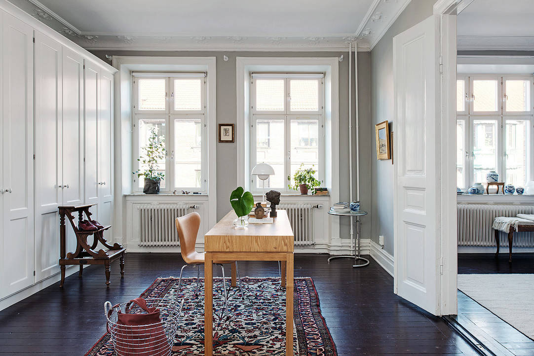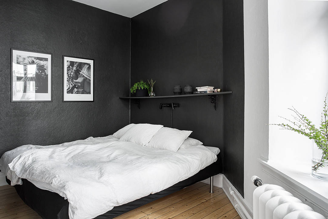 Exempel: I detta rum fungerar det ganska bra med mörka väggar, främst på grund av det stora glasfönstret, som släpper in mängder med ljus, och tegelväggen som bryter av.