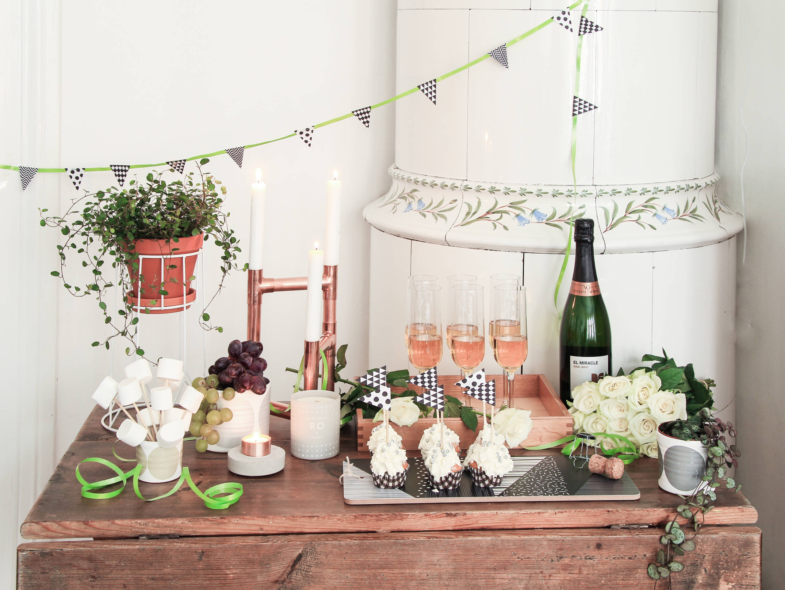 Servera bubbel i dina finaste glas, tänd ljus och sätt fram blommor. Lägg upp frukt och godis i ovanliga skålar, trä upp godiset på pinnar och pimpa fikabrödet med festliga vimplar.