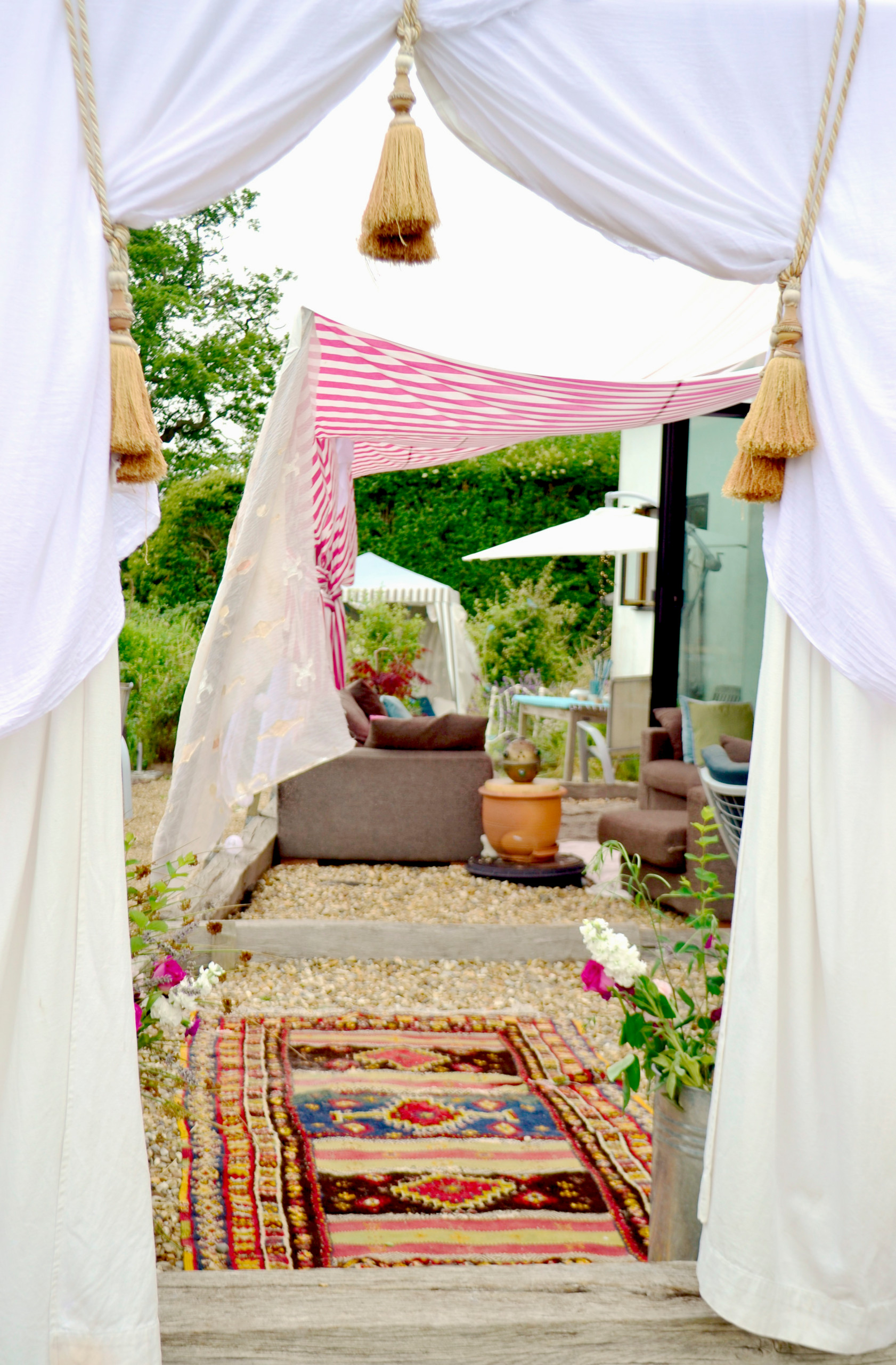Textilier skapar en ombonad känsla. Plocka fram kuddar, lägg ut mattor, häng upp vita lakan som tak och skärmar. Glöm inte filtarna – de kan behövas i de svenska sommarkvällarna!