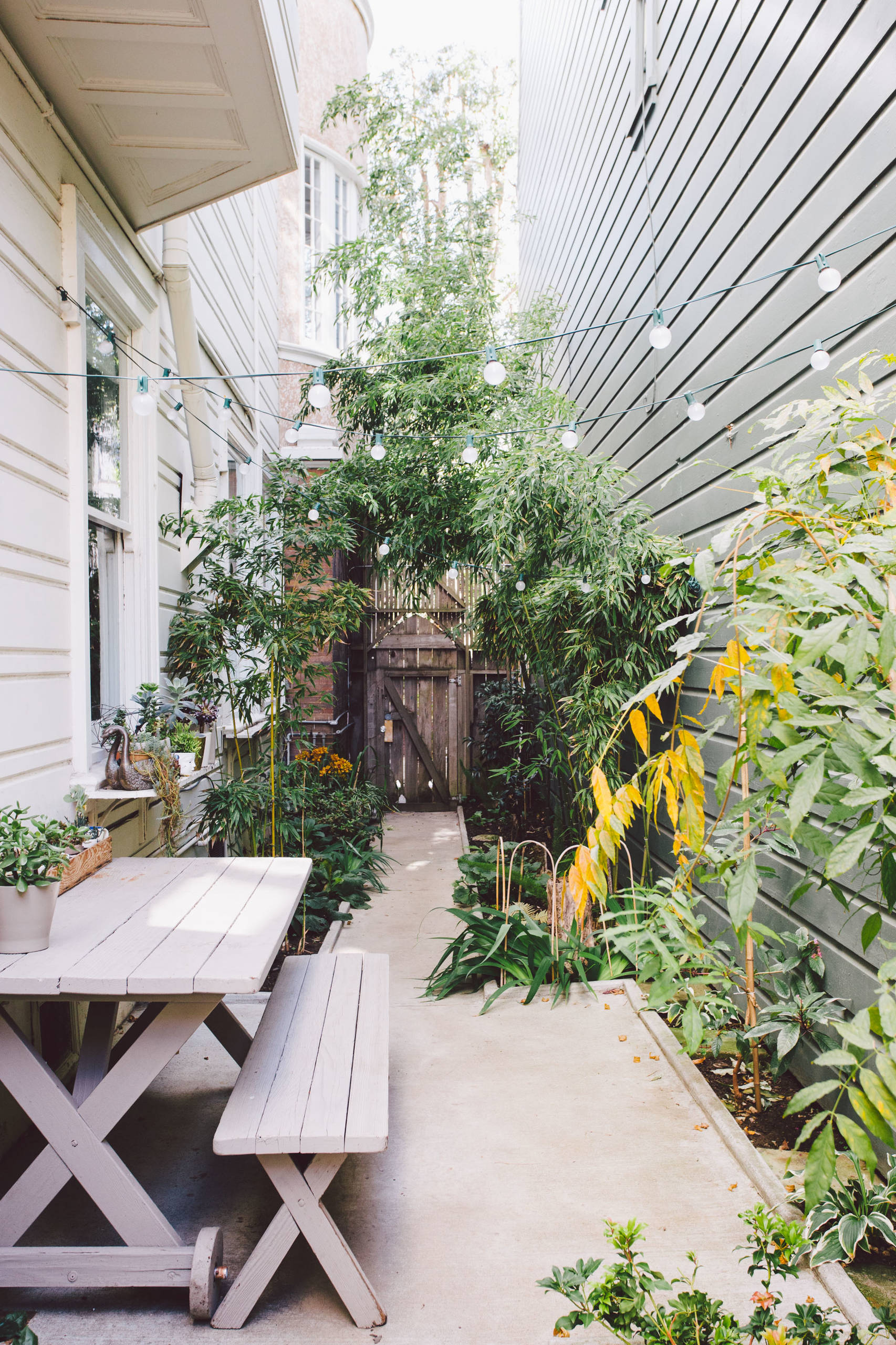 Ljusslingorna från i julas fungerar bra som dekoration i trädgården. Stämningen när skymningen faller blir magisk och gör att man vill stanna ute länge.